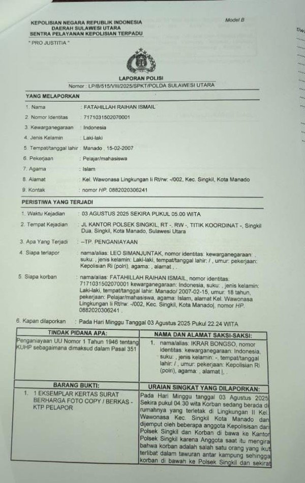 Laporan resmi pun dilayangkan oleh keluarga ke Polda Sulawesi Utara dengan nomor LP/B/515/VIII/2025/SPKT/Polda Sulawesi Utara. Hasil visum memperkuat dugaan kekerasan.