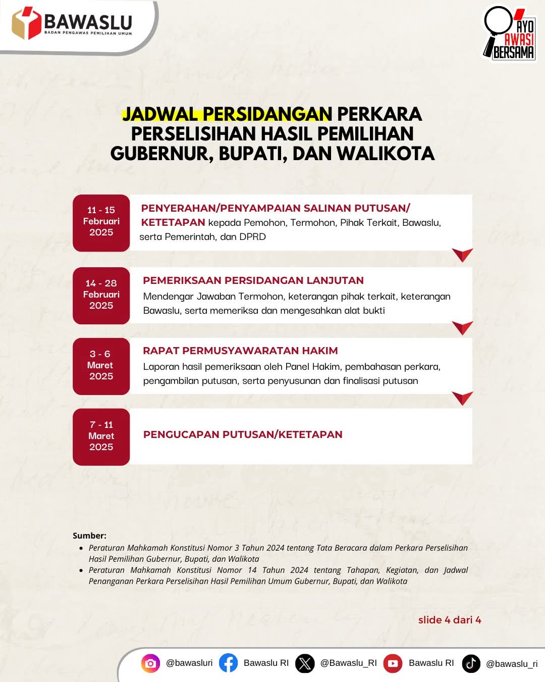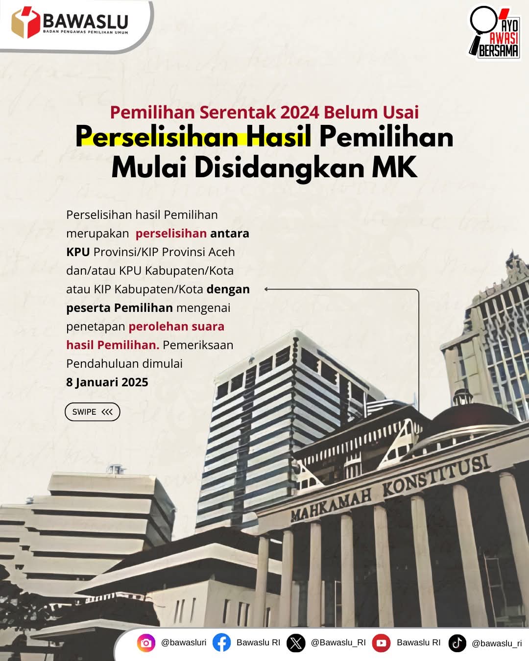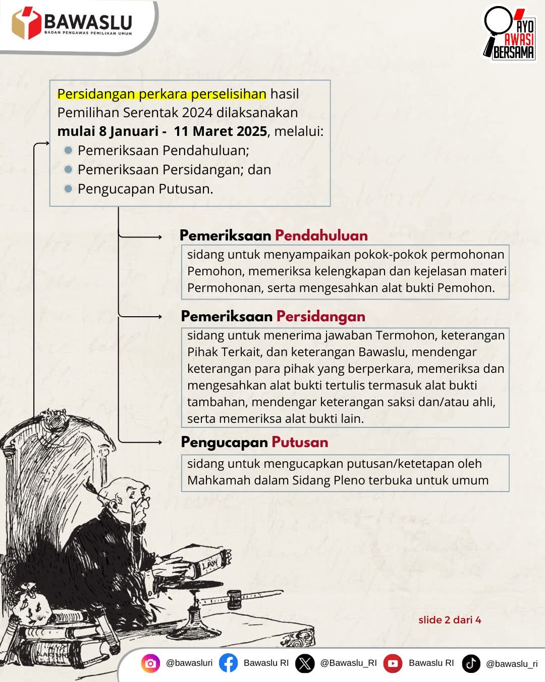 “Persidangan perkara perselisihan akan dimulai sejak 8 hingga 11 Januari 2025 dengan agenda, pemeriksaan pendahulu, pemeriksaan persidangan serta pengucapan putusan ketetapan Mahkamah dalam siding pleno terbuka untuk umum.”kata Ambar.