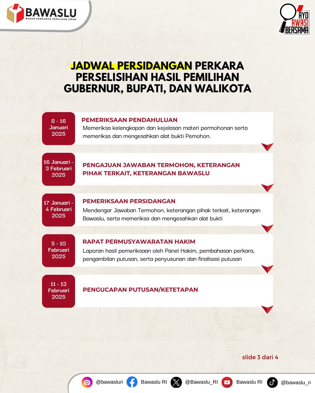 Ketua Bawaslu Minahasa Utara Rocky M Ambar menjelaskan, berdasarkan jadwal yang ada, tanggal 8 Januari 2025 akan dimulai pemeriksaan pendahuluan terkait perselisihan antara KPU Provinsi, Kabupaten dan Kota dengan peserta pemilihan terkait penetapan perolehan hasil suara.