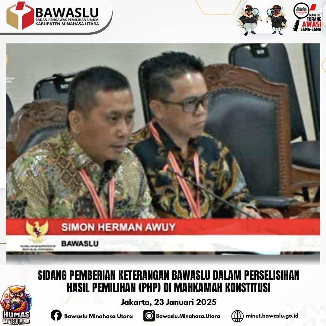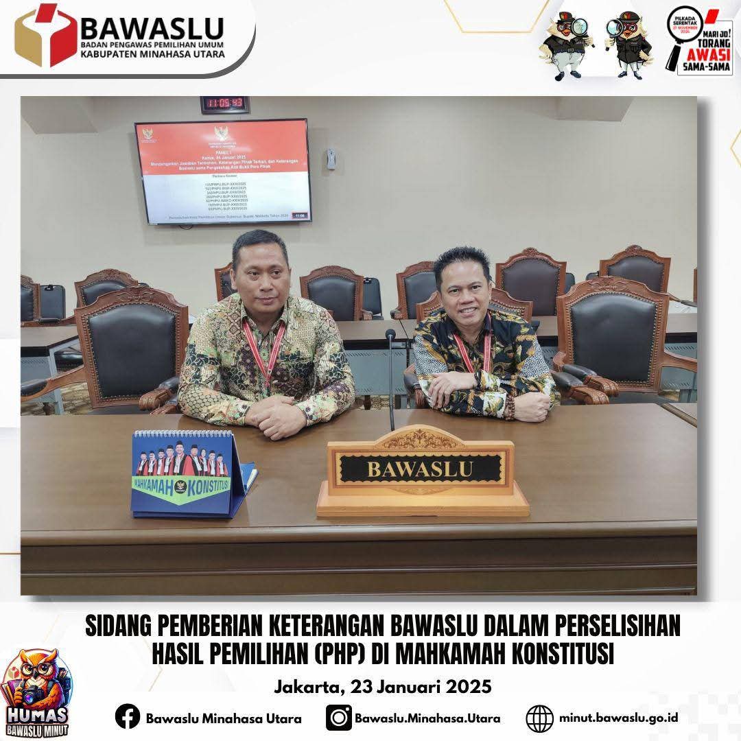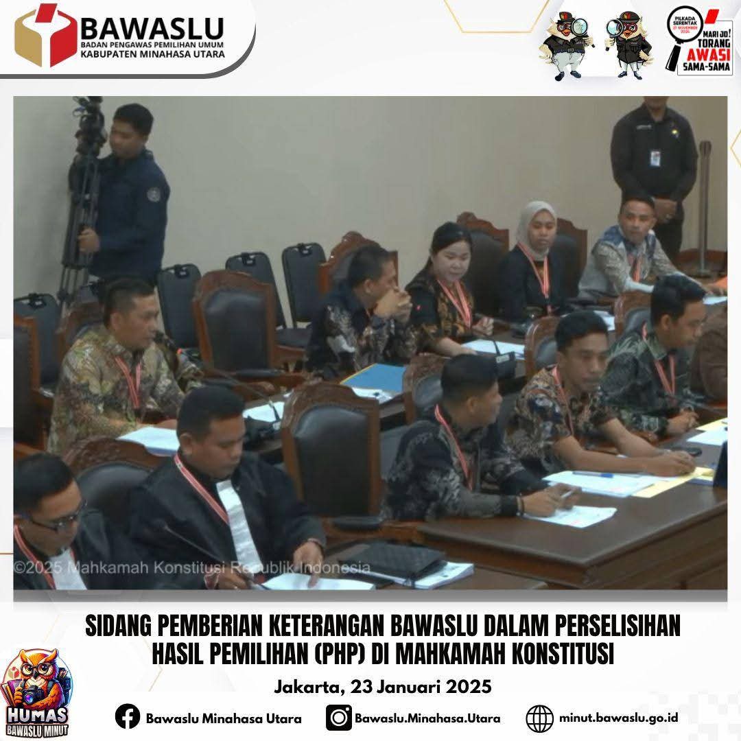 Jakarta,Fajarmanado.com – Badan Pengawas Pemilihan Umum (Bawaslu) Kabupaten Minahasa Utara hadir dalam sidang perkara perselisihan hasil pemilihan Bupati dan Wakil Bupati Minahasa Utara di Mahkamah Konstitusi (MK), Kamis (23/1). Kehadiran pimpinan Bawaslu ini merupakan bagian dari tugas dan tanggung jawab Bawaslu untuk memastikan proses demokrasi berjalan sesuai dengan prinsip keadilan dan transparansi.